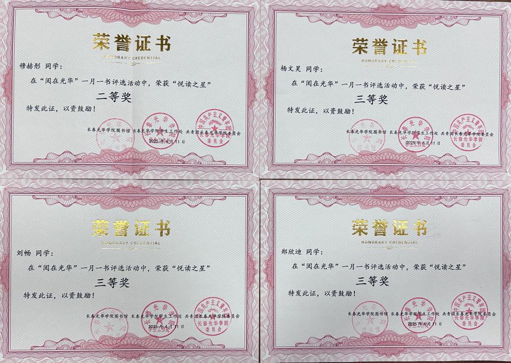 2025年4月3日,taptap点点在taptap点点2024年“阅在光华”一月一书活动中荣获“优阅学院”称号;电信24401班等6个班级荣获“书香班级”称号;电信23401班刘畅等12名学生荣获“悦读之星”称号。