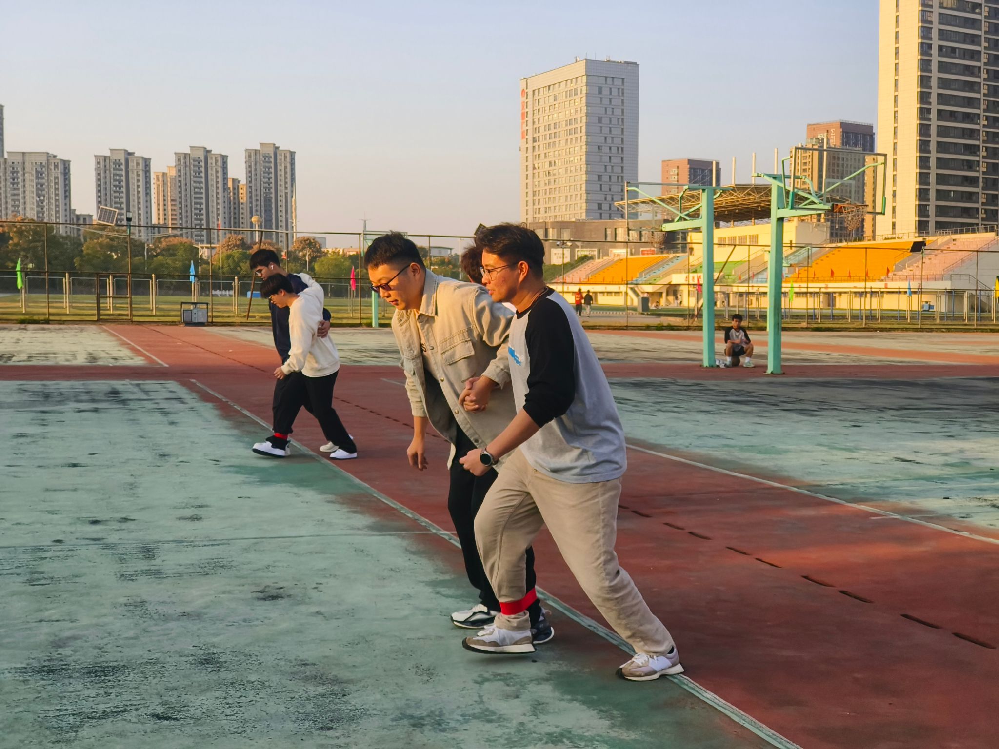 袋鼠跳接力比赛中,同学们身着袋鼠跳袋子,跳跃着前进,场面既滑稽又充满挑战。趣味投篮项目中,男生们奋勇投篮,女生们更是巾帼不让须眉在比赛中大放异彩。多人跳绳接力则考验了同学们的默契与节奏感,大家齐心协力,共同完成了比赛任务。两人三足接力更是将现场气氛推向了高潮,同学们两两绑腿,携手并进,欢呼声与加油声此起彼伏。