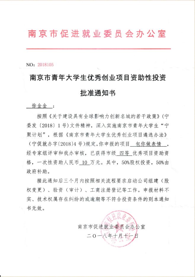 2018年10月11日,在南京市大学生优秀创业项目评比中,BB贝博艾弗森官方网站学子徐金金、韦苗苗“依智科技”团队申报的“包你做表情”项目,被评为南京市大学生优秀创业项目,获得市级四等资助资格,一次性资助10万元。同时,该项目在中国高校计算机大赛(微信小程序应用开发赛)中获得华东赛区三等奖。