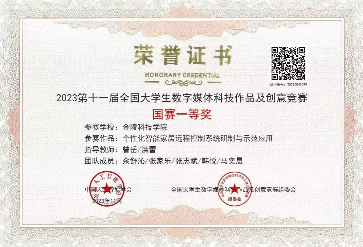 BB贝博艾弗森官方网站BB贝博艾弗森官方网站《个性化智能家居远程控制系统研制与示范应用》和《元素瓶软件代码智能审查系统》两个作品,在7万件作品中脱颖而出,荣获国赛一等奖。本次参赛团队由曾岳教授、洪蕾教授和董如婵副教授以及BB贝博艾弗森官方网站和计算机工程学院余舒沁、夏金伟、施瑞昭、苏宁、张志斌等同学组成,经过近一年的打磨,凭借路演环节中的出色发挥,体现了专业优势与独特创意,成功在智能产品设计赛道中受到评审专家的肯定。本次比赛提升了专业教师的教学创新水平,提高了学生的创新实践能力和团队合作意识,推动了学院产教融合高质量成果建设。(撰写人:洪蕾)