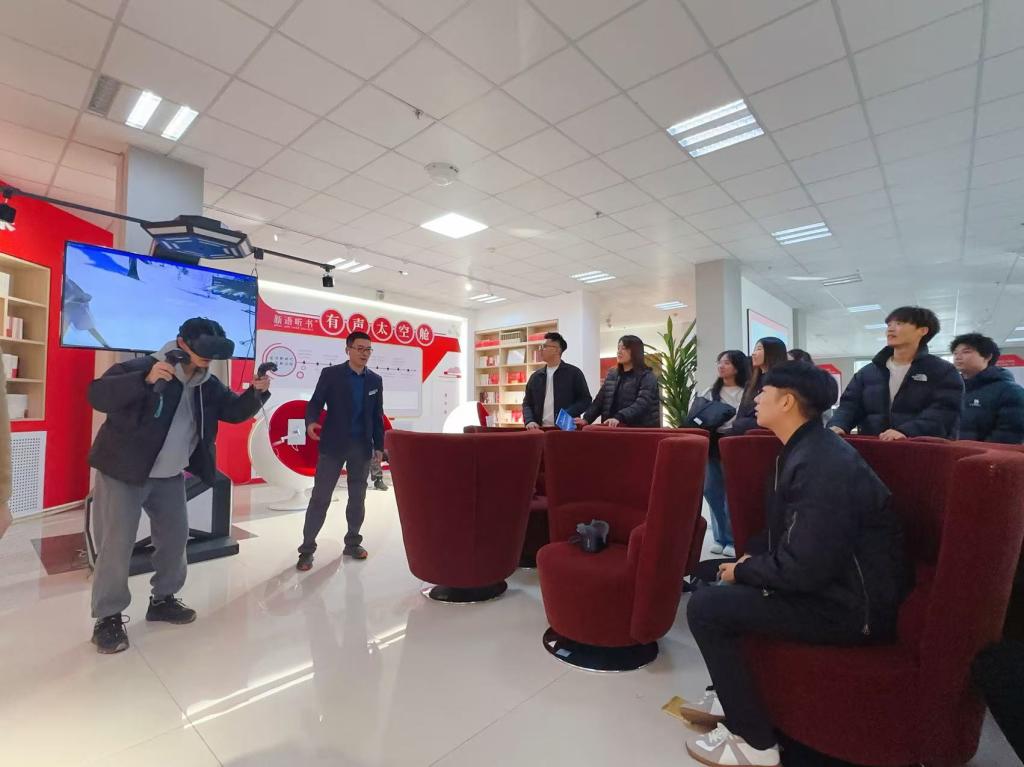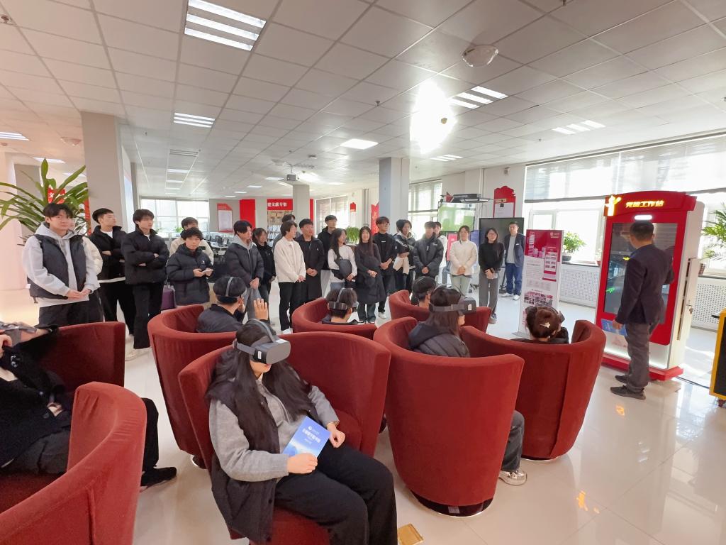活动中,师生党员们首先参观了长春市图书馆数字阅读体验区,了解了馆内数字化借阅服务的特色项目。随后,在工作人员的引导下,大家来到了党建学习园地,在这里,师生们充分领略到了长春图书馆丰富的文化资源与现代科技手段的完美结合,特别是AR(增强现实)技术的应用,为师生们带来了一场文化与科技交融的盛宴。师生们逐一佩戴上AR头显,紧握控制器,眼前顿时呈现出了一个个立体且生动的虚拟世界。在体验过程中,大家被AR技术所带来的震撼效果深深吸引。体验完AR技术后,师生们移步至观影厅,观看了《建党伟业》经典片段,影片生动再现了毛泽东等老一辈无产阶级革命家从青年时期就自觉担负起救亡图存、奋发图强的历史重任,团结带领英勇的革命志士进行了百折不挠、艰苦卓绝的斗争,用青春与热血谱写出中国共产党最为壮丽的历史篇章。