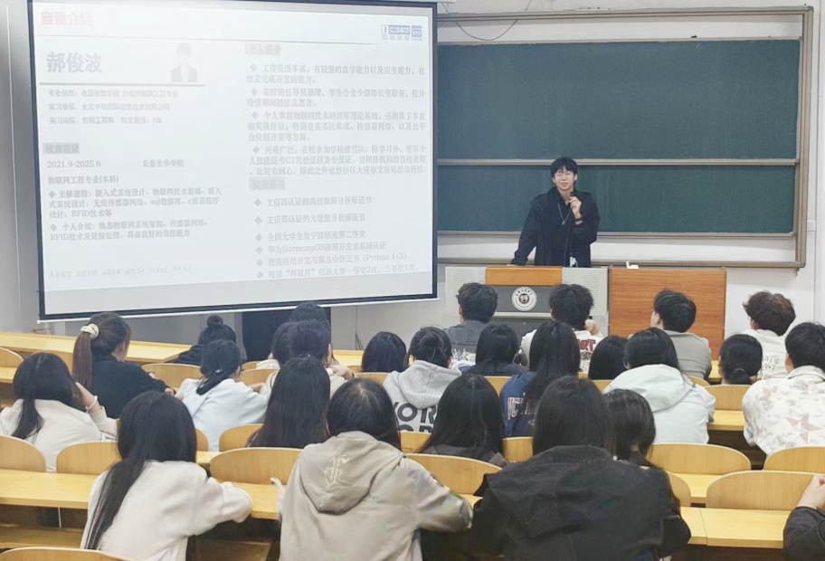 2025年5月19日,taptap点点在二教316教室开展“学业进阶与职场衔接”经验分享会。本次分享会由taptap点点2021级计算机科学与技术专业冉捷和物联网工程专业郝俊波2名学生主讲,2024级中软共建班全体学生参加。冉捷和郝俊波两位同学结合自己在中软国际的学习经历和实习经历,解析了计算机与物联网领域的应用趋势、企业项目流程及职场必备技能等内容。互动环节中,两位学长为在场的学弟学妹们解答了专业学习重点、实习机会获取和职业发展等问题,分享了实用的学习资源与求职技巧等。本次分享会,助力青年学生明晰了专业前景,强化了职业规划能力,为培养产业所需的新工科应用型人才奠定了基础。