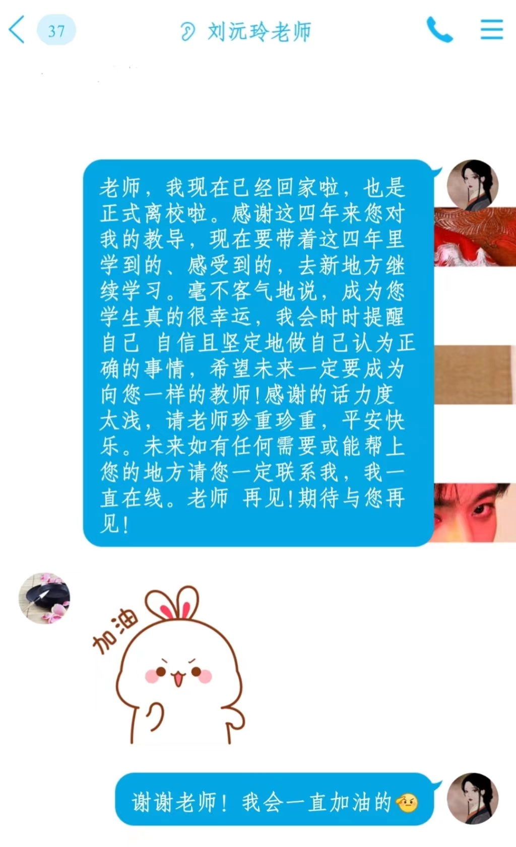 感谢这四年来您对我们的教导,现在我们即将带着这四年里学到的、感受到的,去新的地方继续学习或深造。能够成为您的学生,我们真的很幸运,我们定会努力拼搏,积极进取,乐观向上,努力成为对社会有用的人。感谢的话力度太浅,祝老师们平安快乐!再见,期待与您们再相见!