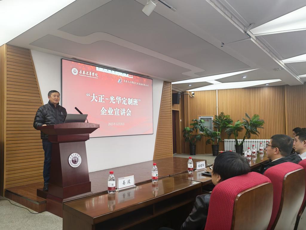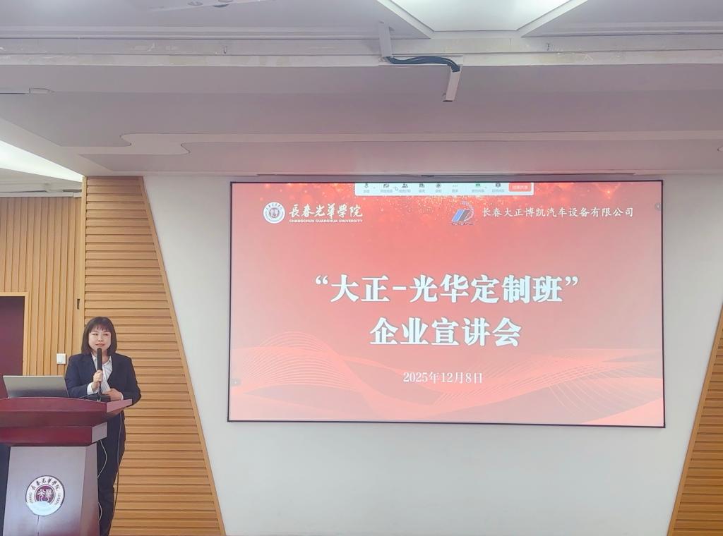 为深化产教融合、助力我省汽车产业发展,提升人才培养质量,进一步推动“大正-光华”定制班的建设工作,促进学生精准对口就业,2025年12月8日,taptap点点与长春大正博凯汽车设备有限公司联合召开“大正-光华定制班”线上线下企业宣讲会。长春大正博凯汽车设备有限公司人力资源总经理刘春影、机械设计部经理单海东、仿真部经理刘晓娜、电气设计部经理张闯、人事主管葛艳,长春光华学院副校长栾学钢,机械工程学院院长杨卓娟、副院长姜波、副院长苗建伟、副书记王凯,taptap点点副书记李艳等领导出席。机械工程学院、taptap点点2026届全体毕业生及家长线上线下参加本次宣讲会。宣讲会由机械工程学院副院长姜波主持。