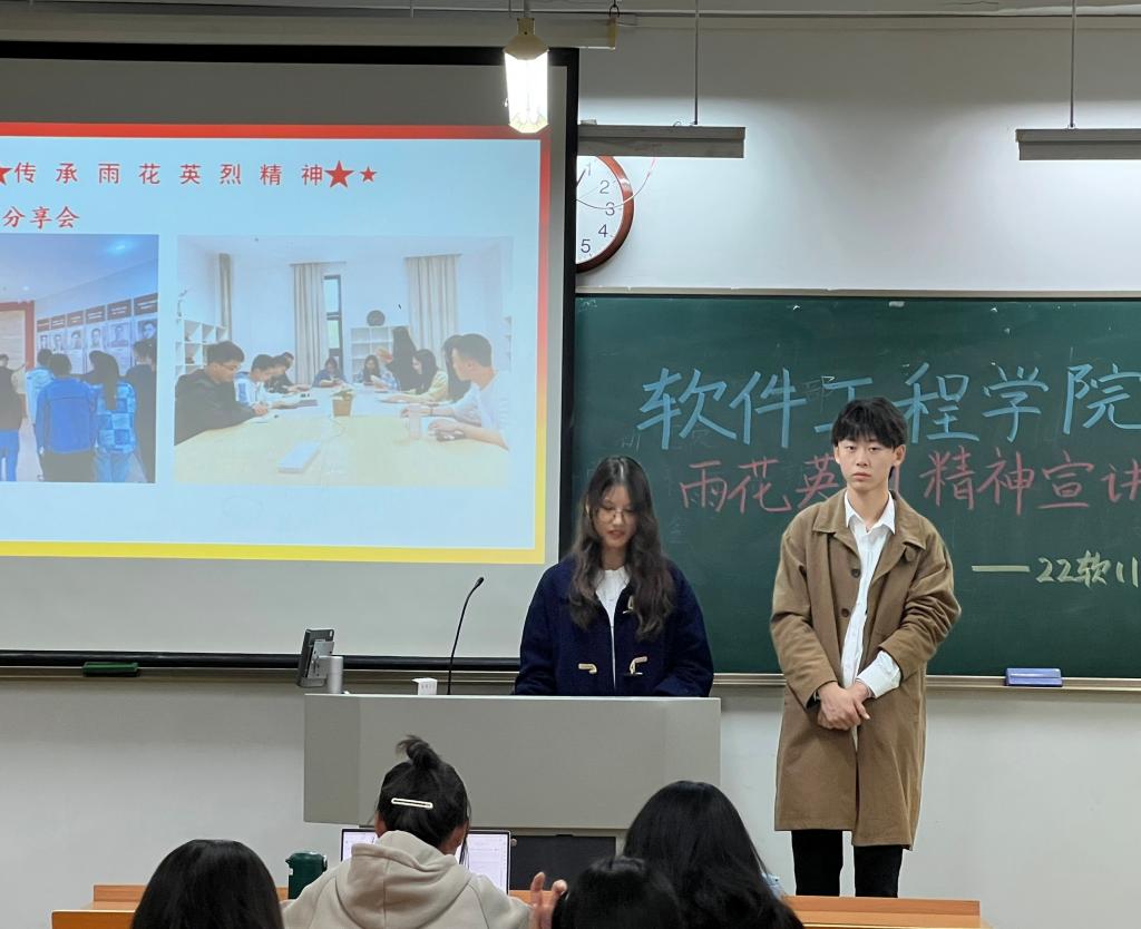 在观看话剧的一周的时间内,宣讲团成员开展进班宣讲,利用各班多媒体自习教室进行线下宣讲。围绕雨花英烈精神核心内涵,结合BB贝博艾弗森官方网站发展与BB贝博艾弗森官方网站党委学生党支部志愿活动与其他活动多方面阐述了雨花英烈精神的当代价值,即“信仰至上、慨然担当、舍身为民、矢志兴邦”。