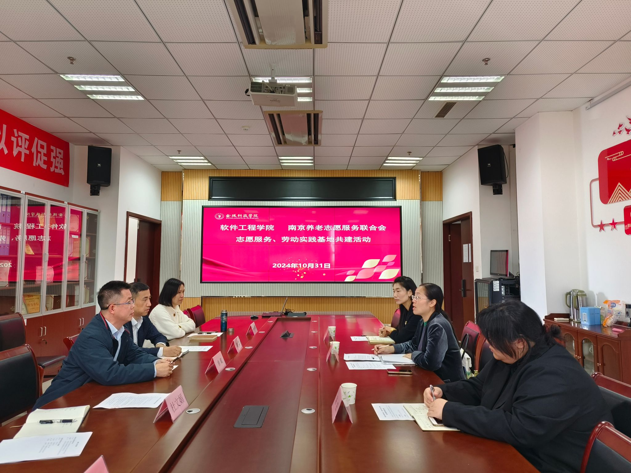 座谈会上,学院党委书记戴军对南京养老志愿服务联合会的到来表示热烈欢迎,戴军表示,学院一直致力于培养具有社会责任感和创新精神的软件工程人才,与南京养老志愿服务联合会的合作交流将有助于拓宽学生的视野,增强他们的实践能力,希望能结合大学生思政工作探索出更多合作模式。党委副书记徐斌介绍了学院在人才培养、科研创新以及社会服务等方面的工作成效,他指出希望通过校企合作为学生提供更多元化的就业机会和实习平台,同时建立志愿服务社区基地,更好的发挥青年大学生的社会服务功能。会上,南京养老志愿服务联合会赵倩对学院的热情接待表示感谢,详细介绍了南京养老志愿服务联合会的企业平台合作的创新模式和运营成果,并对双方此前的志愿服务项目合作表示了充分肯定,期待在学生人才培养和志愿服务等方面进行更深入合作。