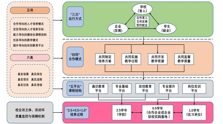五平台:依托通识教育平台、专业基础平台、双创教育平台、专业提升平台、岗位实训平台设置的课程结构。